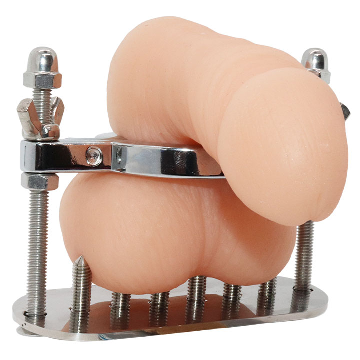 Adjustable steel ball crusher with removable spikes for added punishment and CBT bliss!